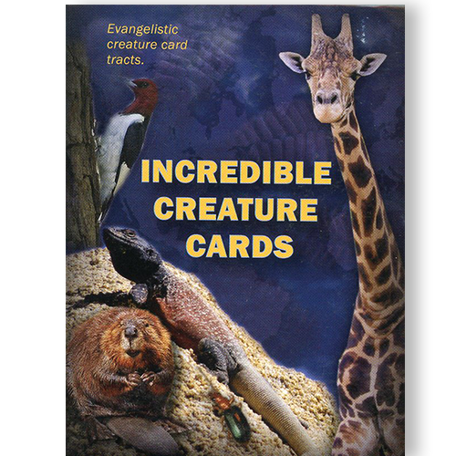 Trading cards – by “Biblical Discipleship Ministries”; sold by “Creation Today“; various sets; image of “Incredible Creature Creation Tract Cards” (50 pack); also offers “Creation Proclaims: Climbers & Creepers Creation Tract Cards” (50 pack) and “Amazing Animals of Alaska Creation Tract Cards” (50 pack).
